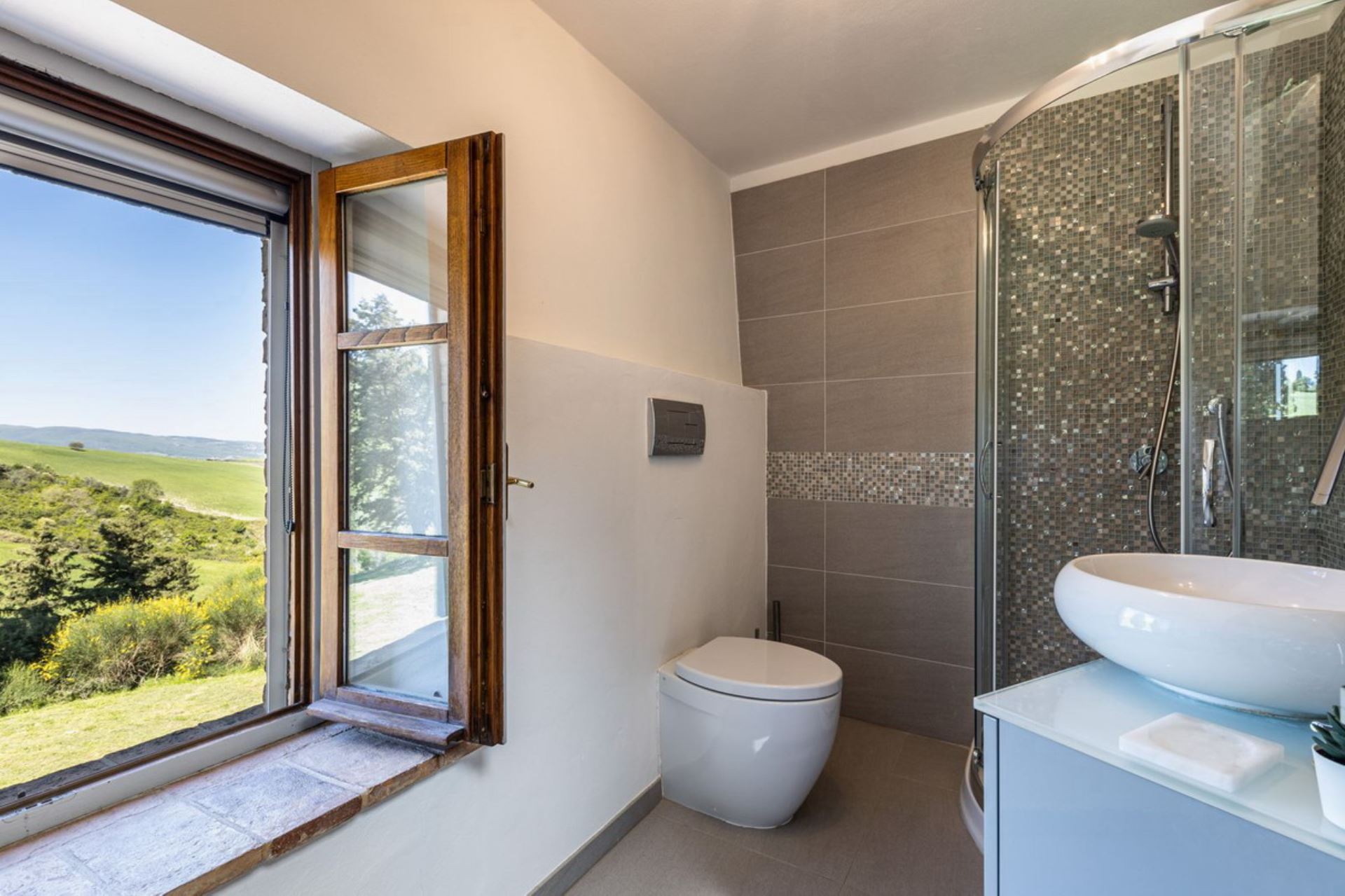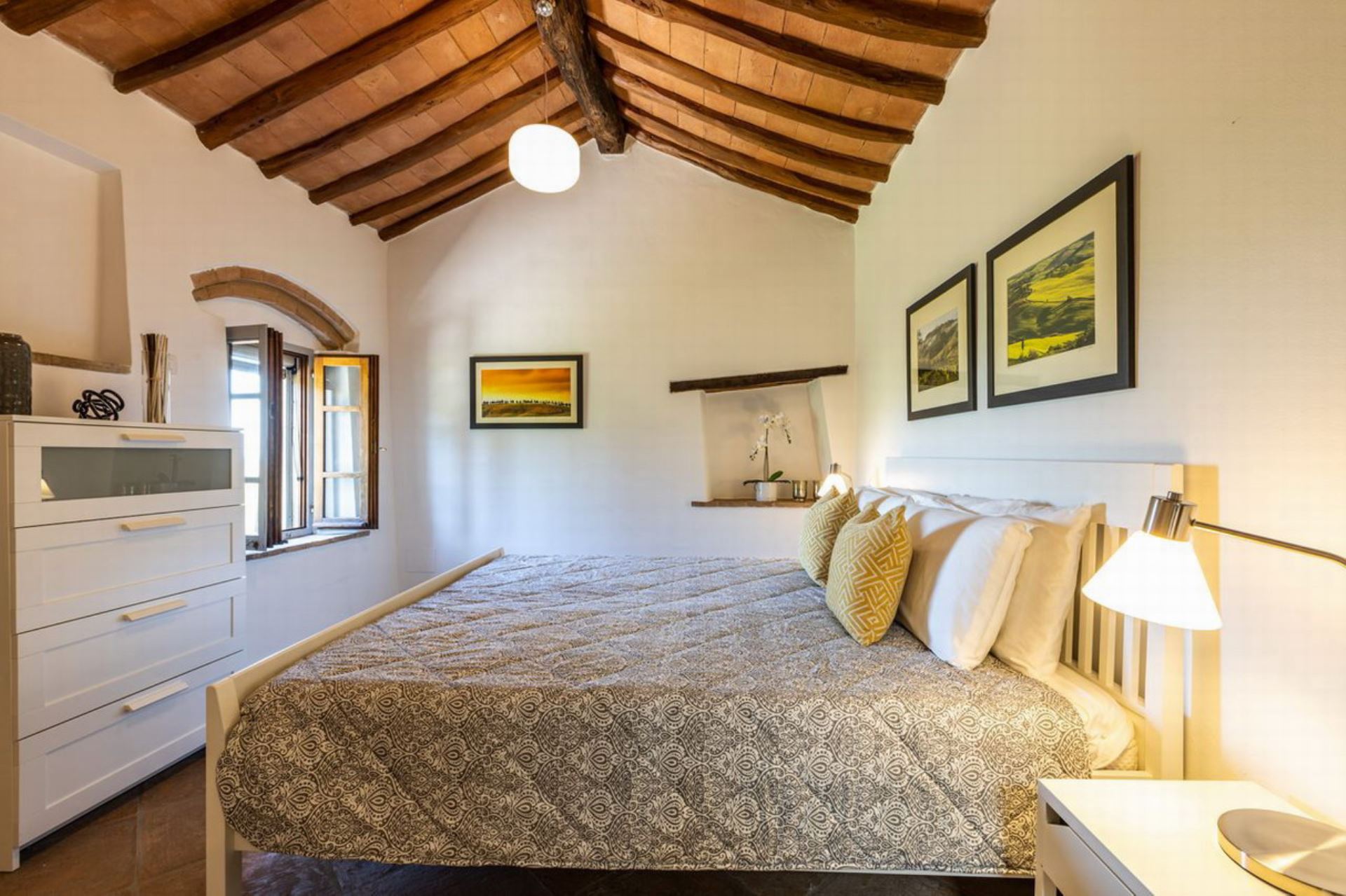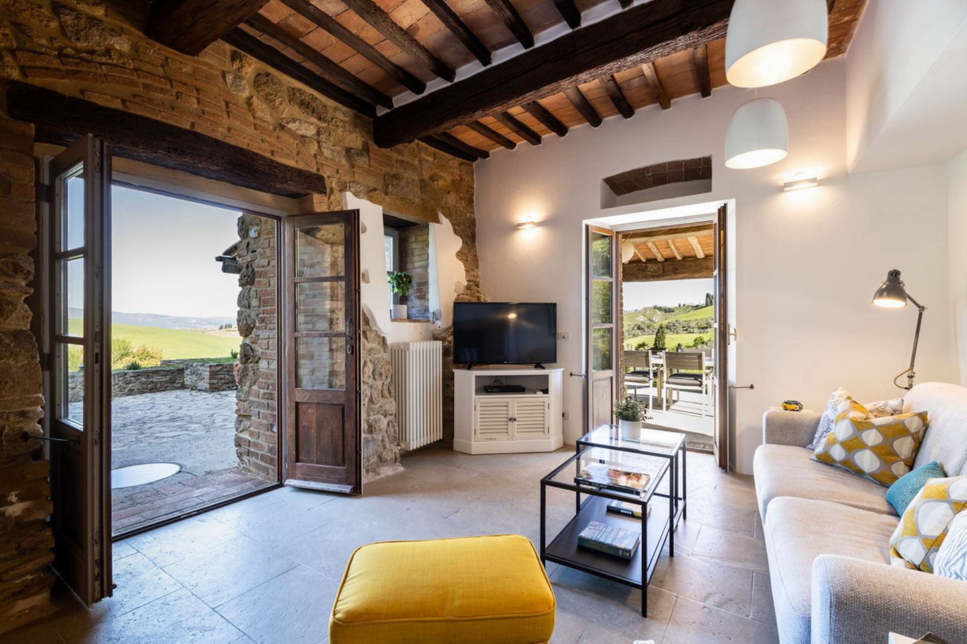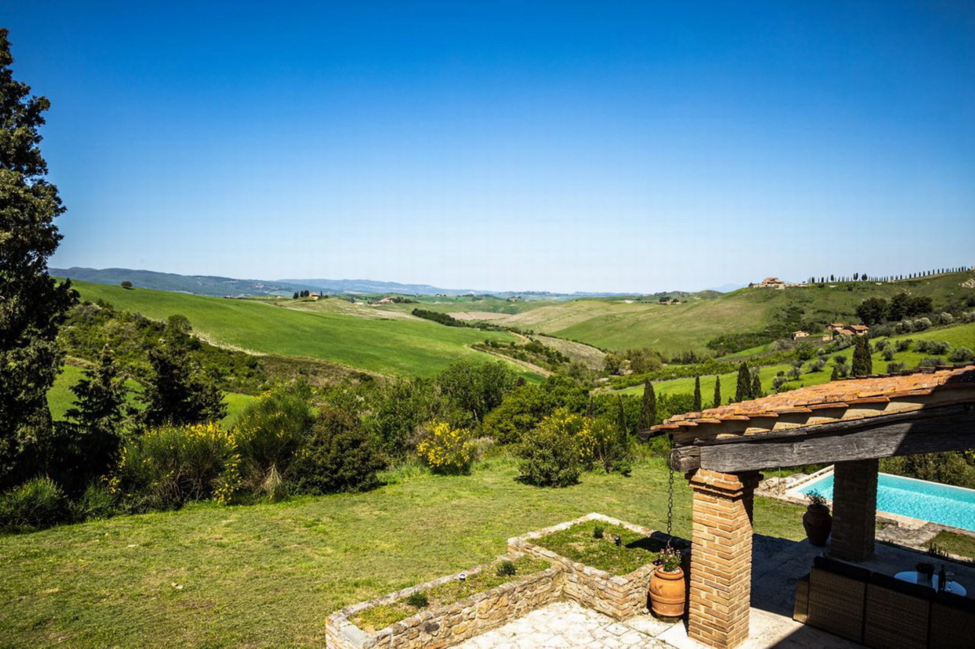 Villa Cantucci is an independent house privately situated between the Val d’Era and the Val di Cecina at only 2 km from Volterra and 25 from San Gimignano. The area for miles around is a jewel-case of natural beauty. This well restored villa is set in a stunning position at the feet of the Etruscan town. The house is very comfortable furnished and both from the pool and large windows are incredible views of the area. Villa Cantucci is a beautiful renovated villa for a family or a small group of friends and itself has been recently restored to a good standard, maintaining many traditional features and blessed with modern comforts in a thoroughly traditional and rustic setting. The interior is filled with lovely stylish touches and good quality furnishing. The pool with a nice view, the patio and the barbecue are perfect for outdoor summer fun, relaxing and dining with sun all day long. Swimming pool is open from April 15th to October 15th. Extra costs are payable at location: Visitor's tax 2,5 euro per day per person - pets 50 euro each one