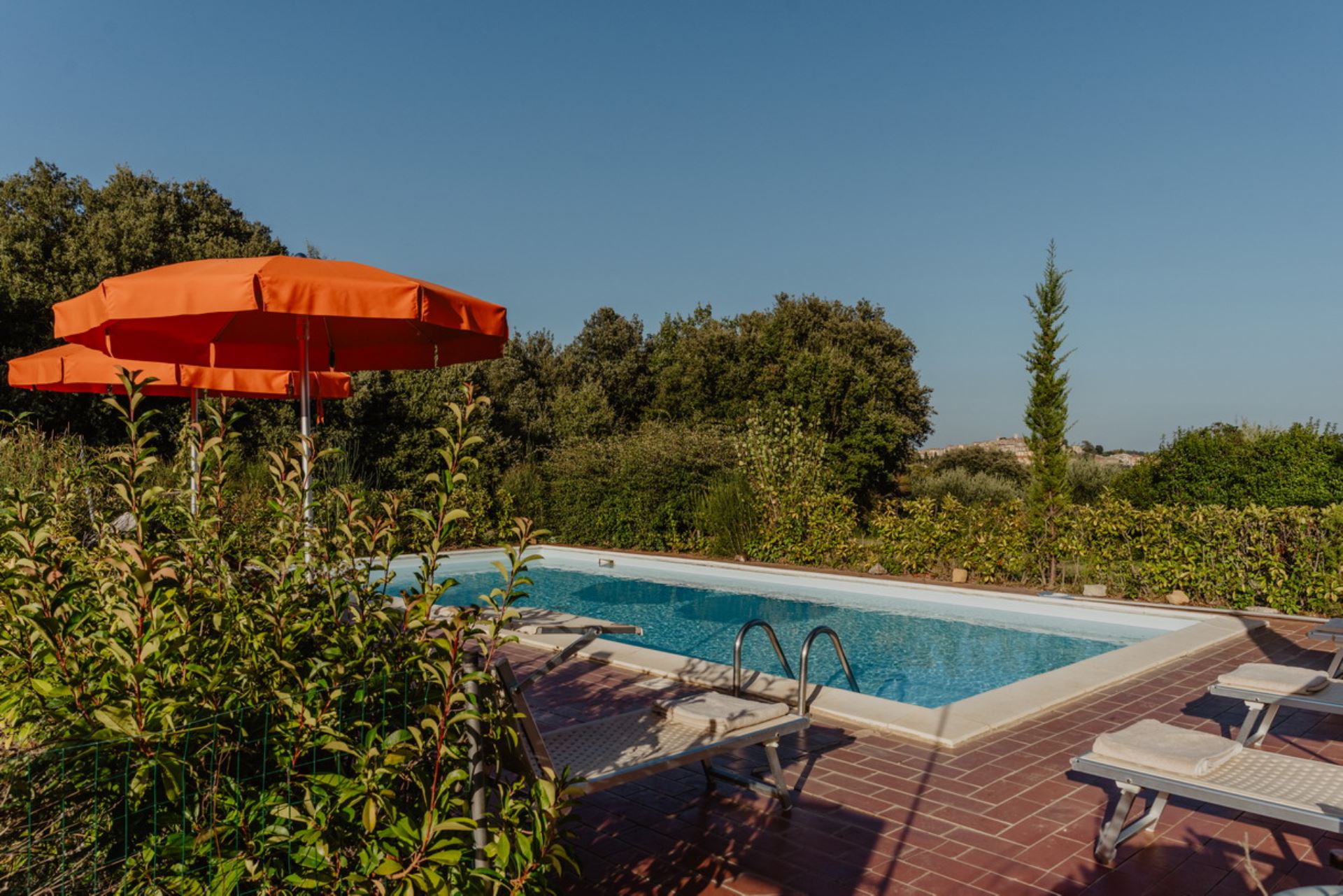 Villa Donatella lies in the south-east part of the wonderful country-side of Tuscany. This lovely villa is situated on the top of the hill, at 400 meters above the sea level and it is encircled by vineyards, olive groves and the most beautiful views of the Crete Senesi,and Val d’Orcia, This property is part of an important winery where it is possible to taste one of the most renowned Brunello di Montalcino and Chianti. This beautiful brick building typical of Tuscany itself has been restored to a high standard, maintaining many traditional features and blessed with modern comforts in a thoroughly traditional and antique setting. Outside a beautiful garden with an inviting and panoramic pool with external shower and a big gazebo for dining “al fresco”. The ancient medieval village of Trequanda is only 2 kilometres away and there are several interesting places within 40 Km. (Siena,Montalcino, Sinalunga, Pienza, Montepulciano, Cortona and Trasimeno Lake). Restaurant, tennis court and wellness area are in the owner’s farm at only 200 meters.